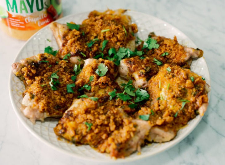 1. Preheat oven to 350 degrees. 2. In a small bowl, combine the chipotle lime mayo, cheese, green onions and cilantro. Stir to combine. 3. Place the chicken thighs on a baking sheet. Sprinkle with salt and pepper. 4. With a spoon spread the mayo mixture on top of each thigh. Making sure to cover the top of the thigh. 5. In a food Processor or high speed blender, Pulse the Chicharron until it resembles bread crumbs. 6. Sprinkle the Chicharron on top of the mayo mixture. 7. Bake chicken in oven for 25-30 mins. Till they reach an internal temperature of 165. 8. Enjoy the chicken while it is still warm.